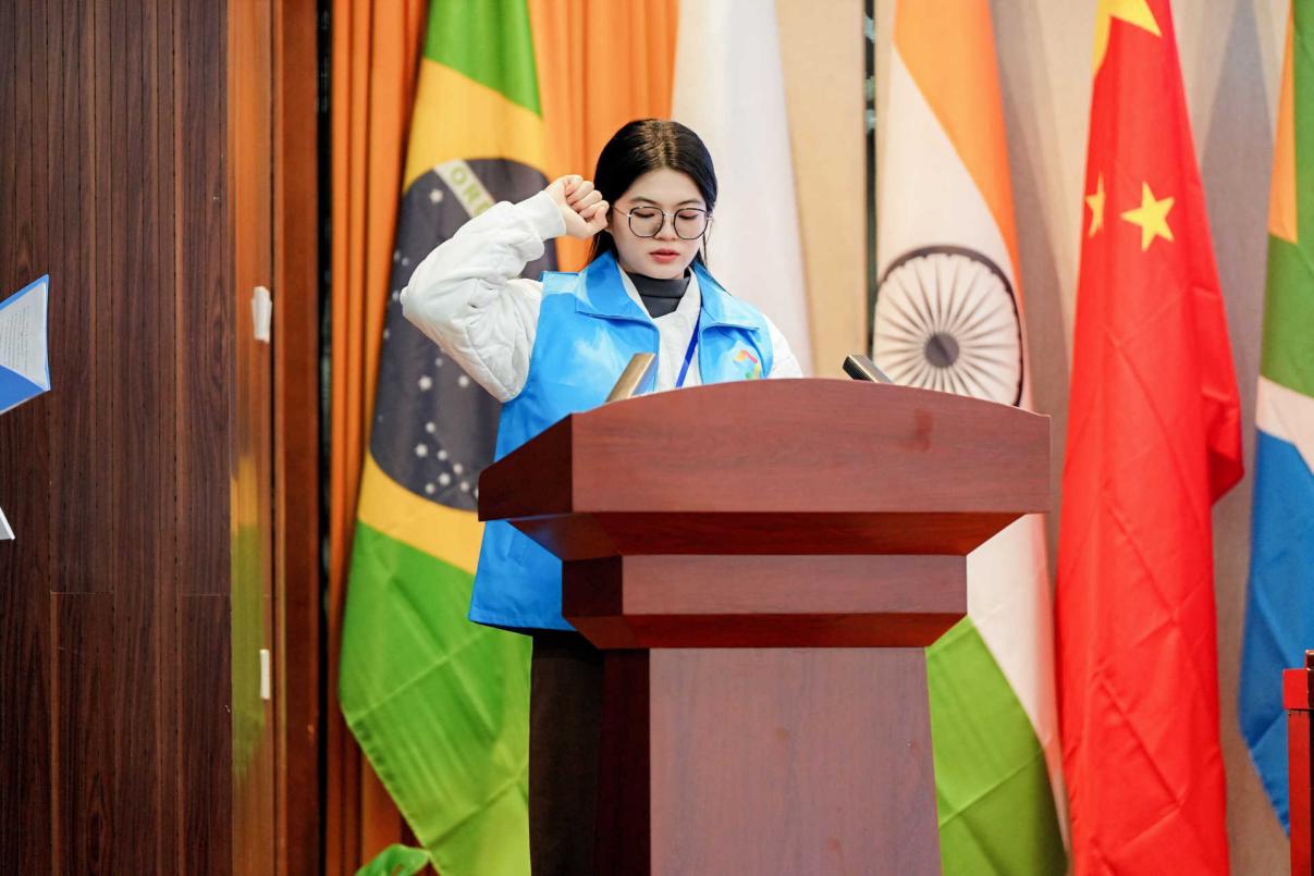 随后,赛事进入庄严的宣誓环节。裁判员代表唐小竣率先登台,郑重承诺恪守赛规、公正执裁;中外选手代表刘庭轩和普尼莱·达拉翁紧随其后,依次宣誓,将以尊重对手、勇于拼搏的态度投入比赛,充分展现良好的竞技风貌。